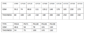 THICKNESS: 80; 100; 120; 150; 180; 200; 230; 250; 300; 150; 54; 75; 100; 145; 130um.